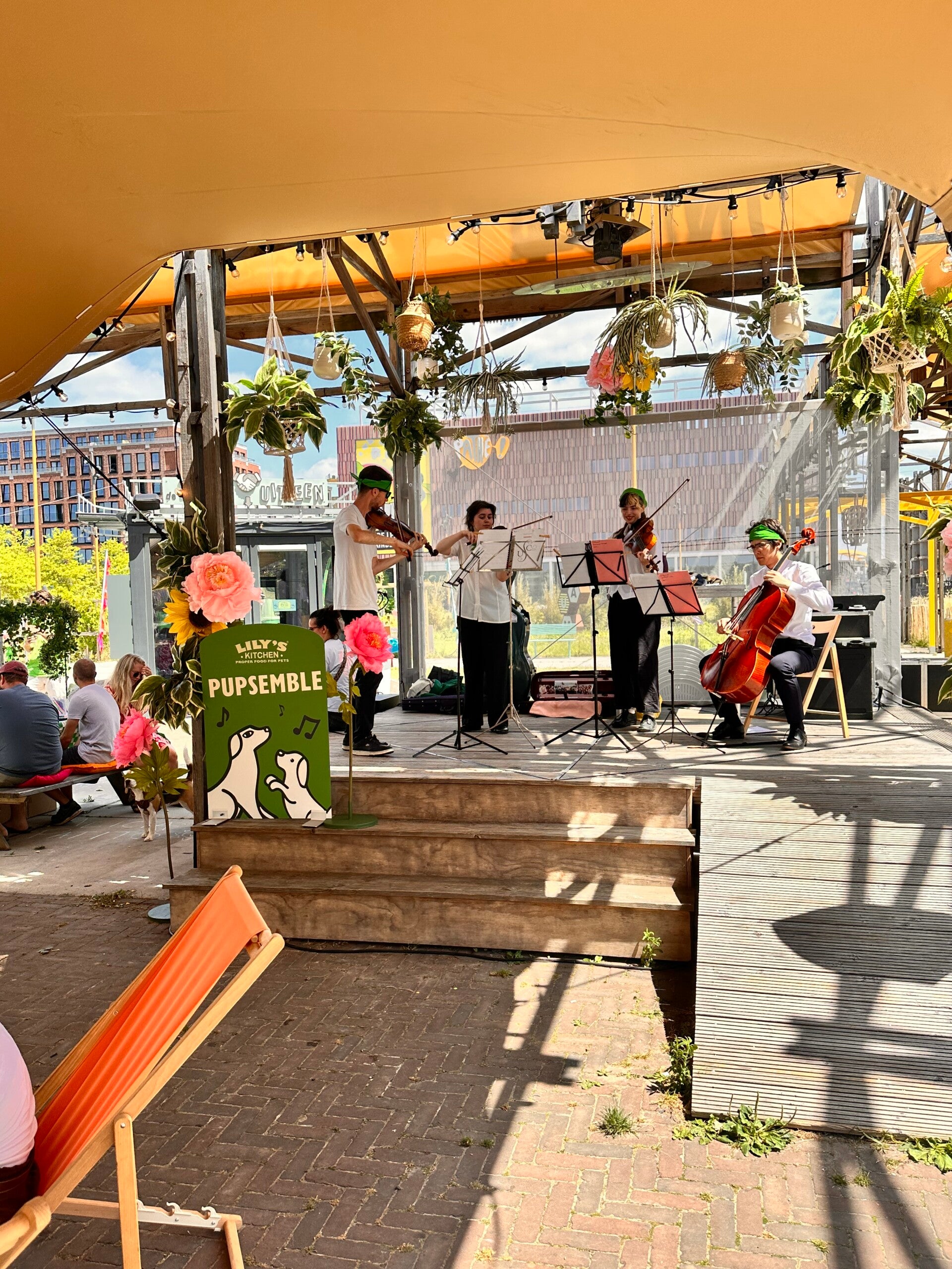 Gezelligheid in de Pupsemble-hoek met liveband (denk ‘Puptown Girl’-vibes!).